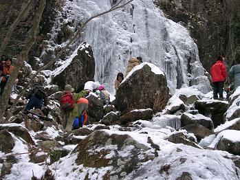 日記を読み返すと「笠形山の扁妙の滝が凍ったという、テレビや新聞の報道を見て行ってきた。滝壷に行く道は前に行ったときより整備してあり、冬で木の葉も落ちているので明るく歩きやすかった。大勢の人(2〜30人)が来ていた。次に滝見台に登ったが、4人しかいない。滝見台から見ると、滝全体が凍り付いていて絶景だ。滝壷にしか行かなかった人は、全体の3の1しか見られない」と書いている。