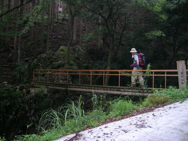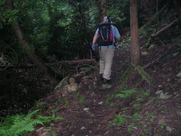 早朝で、曇っているせいもあるが薄暗く、ヒルがいそうな谷道だ。モンベル姫路店で仕入れた「ヤマビルファイター」を登山靴にスプレーしたのが効いたのか、はたまたヒルがいなかったのか、被害に会うことはなかった。