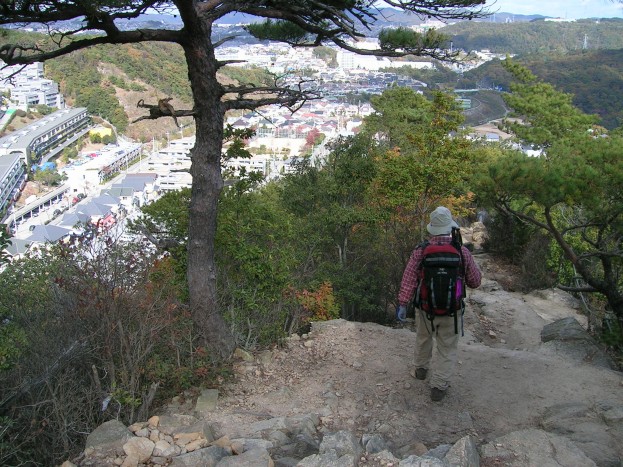 展望図とベンチのある展望所(木が伸びて今は全く展望がない)からは急な階段道が始まっている。平均して下っていればよいのだが、緩い道と急な道の落差がはげしいのが、この辺り山の特徴なのだろうか。