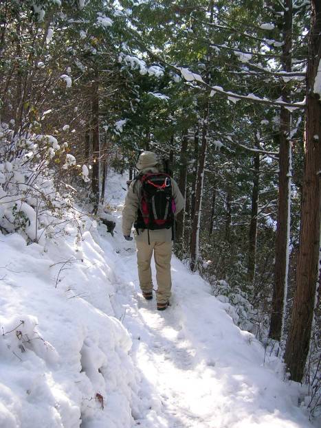 オウネン滝までは平坦な道で、普通なら雪もあまりなく簡単に入れる。ここからは道も傾斜を増し凍結した部分もあり、滑り止めが必要になる時もある。今日は雪は多いが、まだ踏み固められてなく凍結もしていないので、アイゼンなしでも登れるが、着けた方が安全だ。