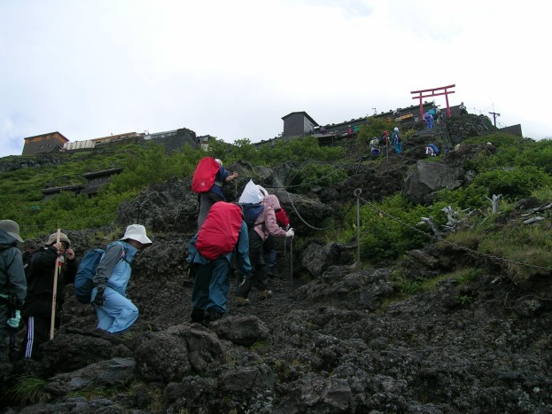 このあたりから御来光前は非常に混雑します。30分ほどで最後の岩場になります。ここが最後なので頑張りましょう。岩場が終われば階段になり、鳥居をくぐると山頂です。