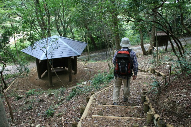 下り始めは急な雑木林の斜面を切り開き、階段道が九十九に付けられている。歴史の重みを感じる魚屋道から、出来立てほやほやの「………の森」風の階段道でその落差は大きいい。