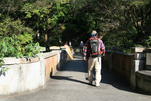 新神戸駅南側では都会の川らしく三面張の真っ直ぐな生田川は、駅北側では渓谷美さえ帯びた布引谷川へと大変身する。その渓谷にかかる「いさご橋」を途切れることないハイカーに混じって渡り、「よし、ハイキングの始まりだ」と気合を入れるも、本当のハイキングは1時間ほど歩いて布引貯水池やお茶屋さんを過ぎないと始まらない。