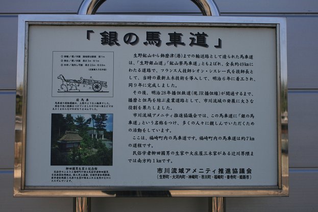 巌橋、柳田國男生家、柳田國男・松岡家顕彰記念館、神崎郡歴史民族資料館(旧神崎郡役所)、旧辻川郵便局、大庄屋三木家住宅と続き、「銀の馬車道」歩きだったのか、福崎町歴史探訪だったのかボーッとしながら歩いていると、大きめな「銀の馬車道」案内板が立っている。
